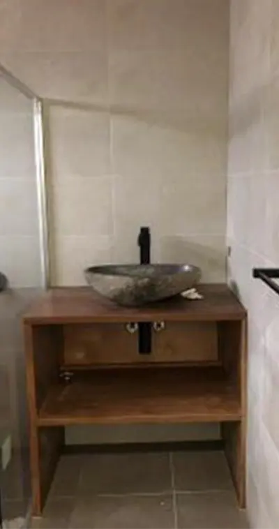 Spotted gum was chosen as the hero material across external cladding, porch, deck, vanities, barn door, entry (Genkan) area and custom shelving. Its rich tones complement the surrounding landscape while adding warmth and character.