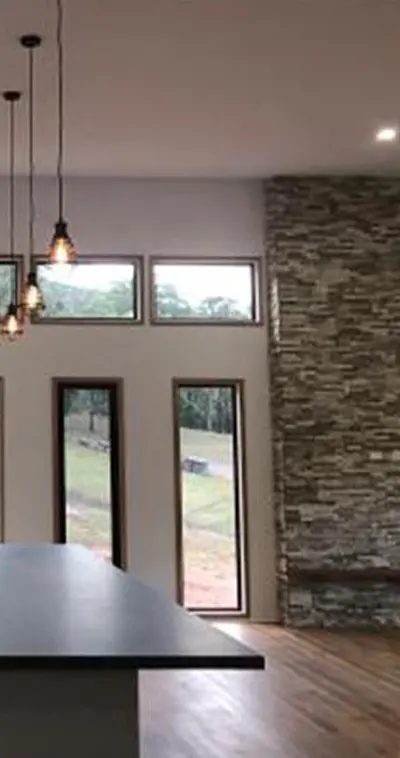 Stone cladding was added to both the façade and a key internal feature wall, bringing visual weight and texture while tying the home firmly to its environment.