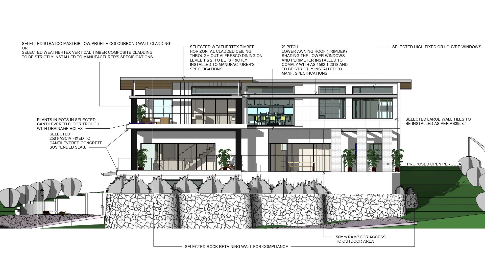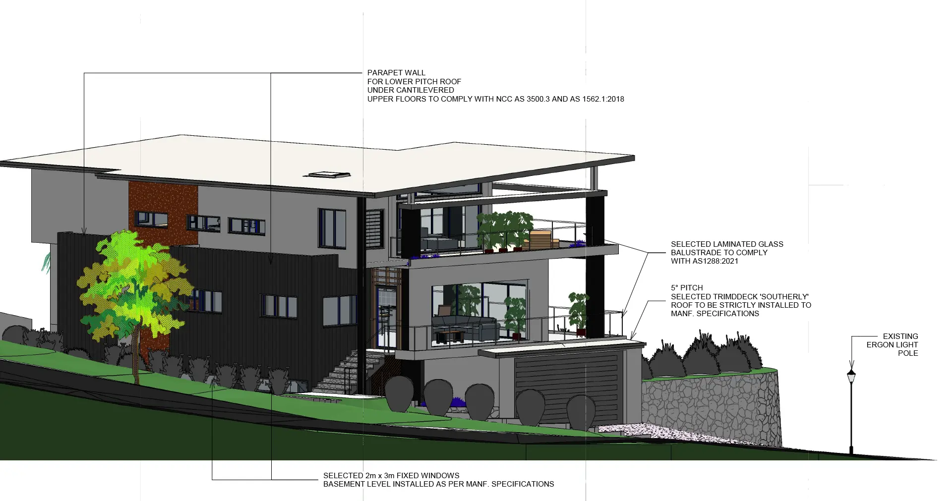 Textural Facade: A mix of materials and a statement upper-level planter overflowing with greenery to soften the scale and enhance street appeal.